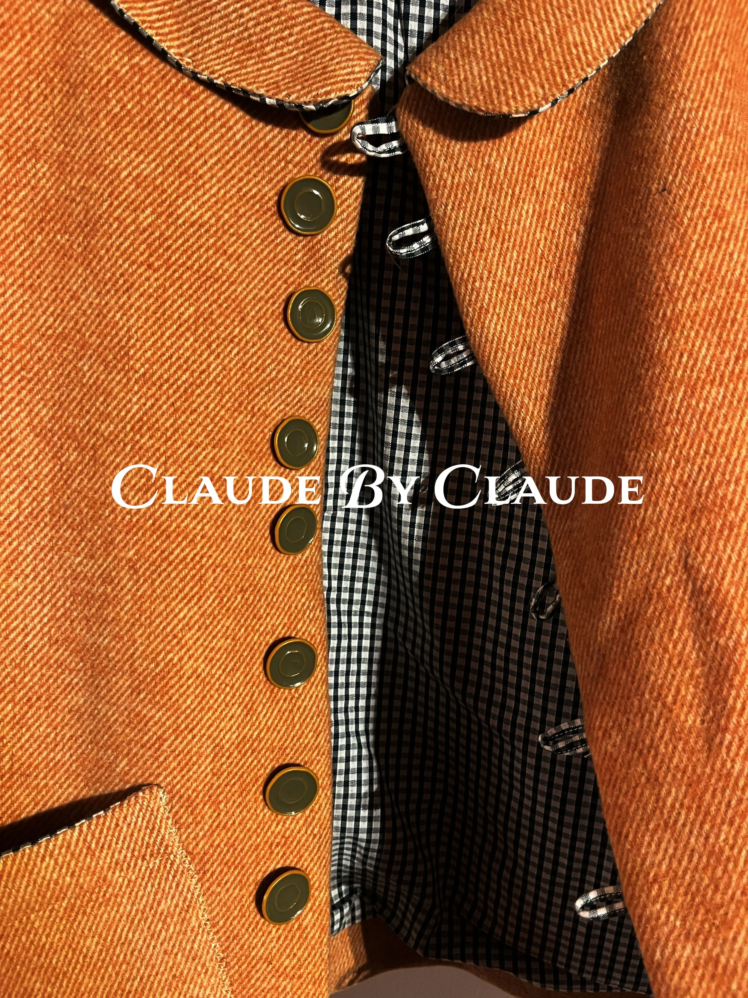 Confectionné à la main à Paris, en laine mélangée orange et doublure vichy verte 100% coton.