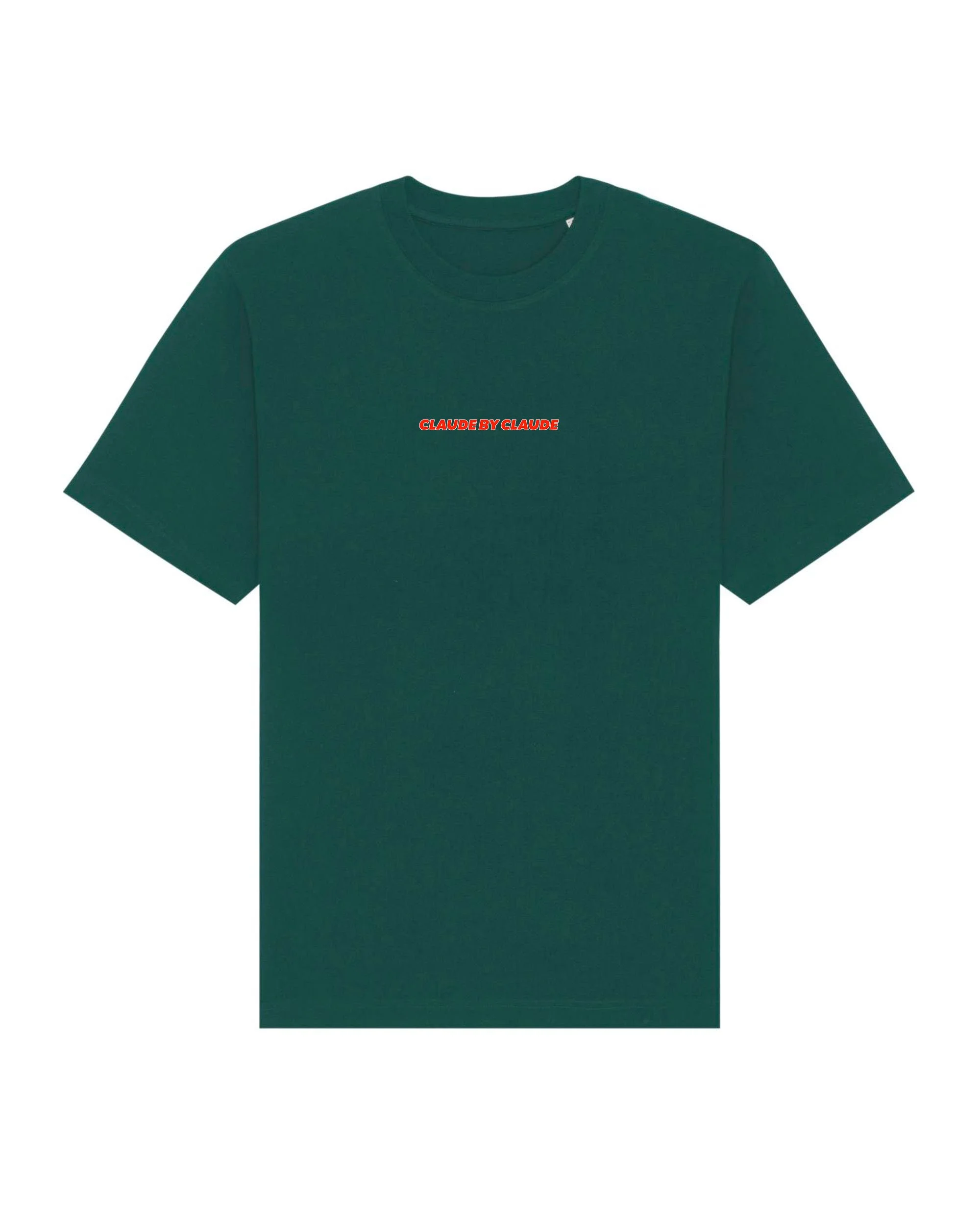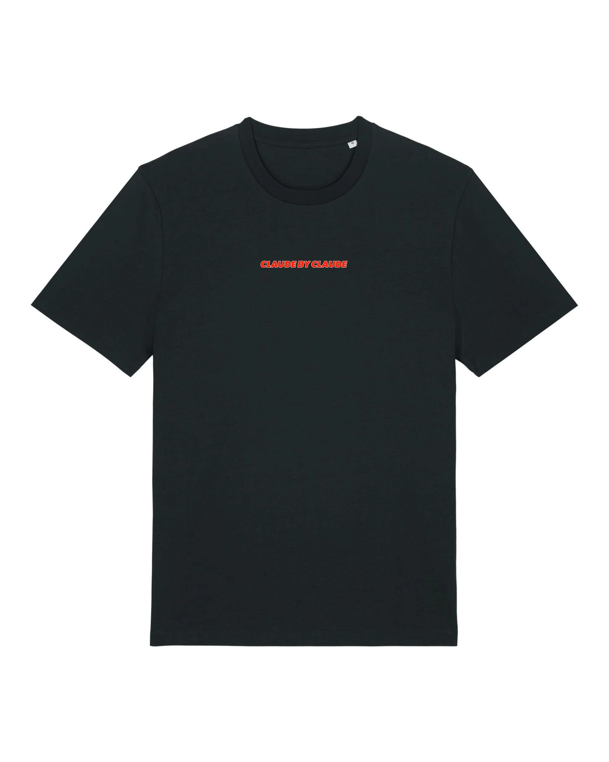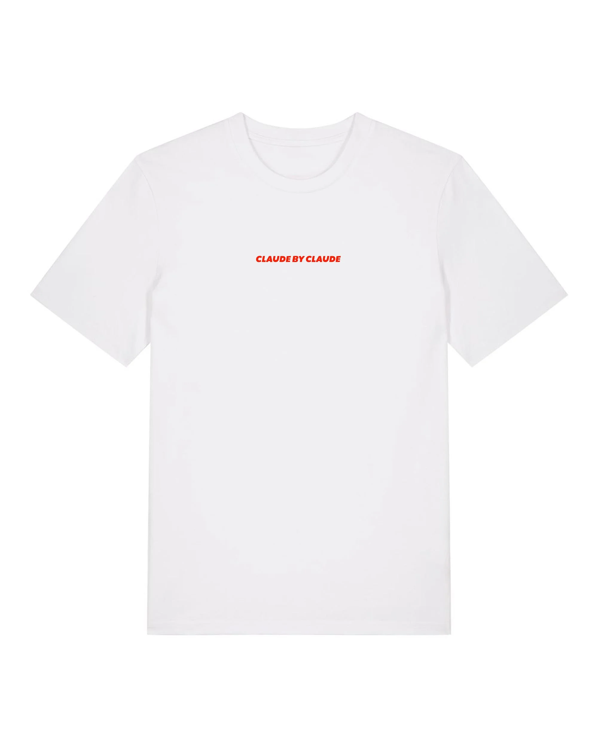 T-shirt graphique arborant le visuel ‘i Love Claude’ rouge détourée sur un fond rose pâle.